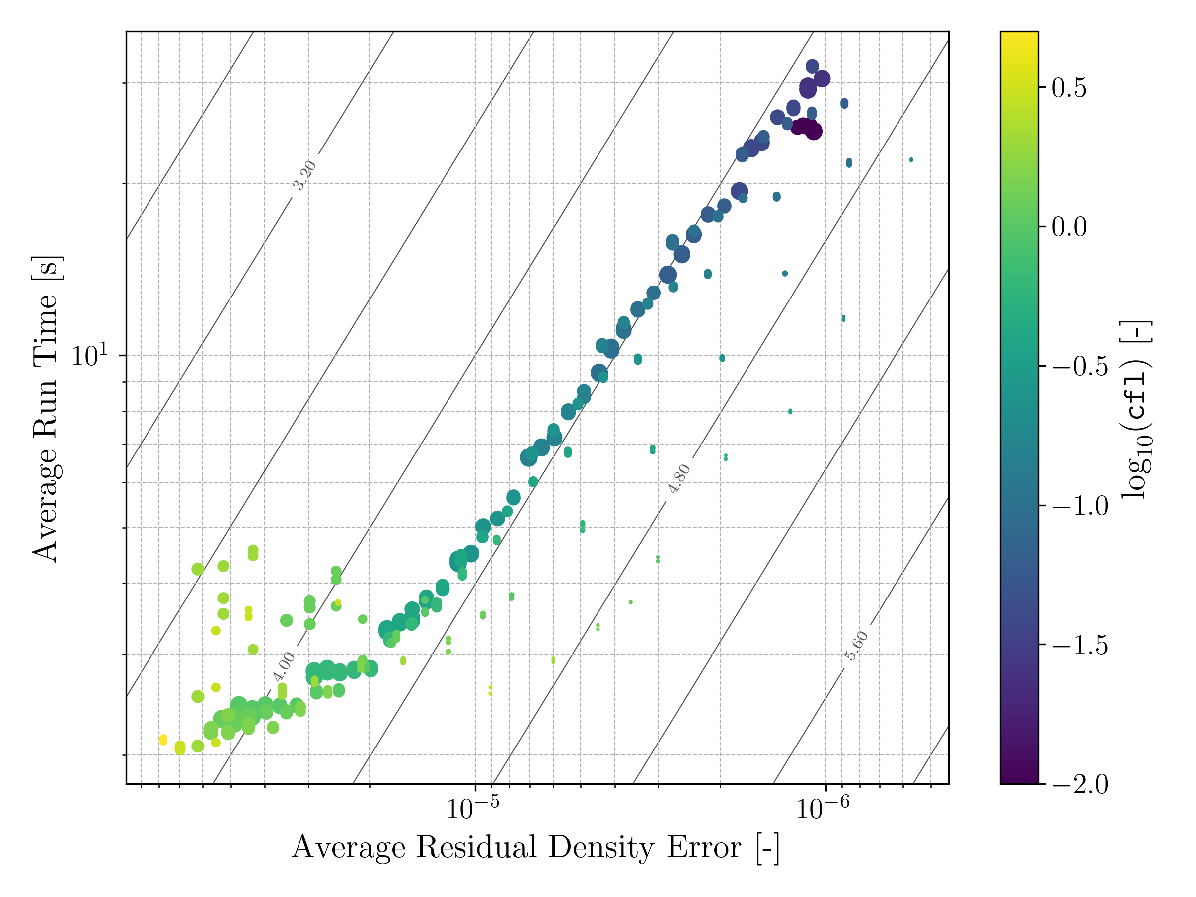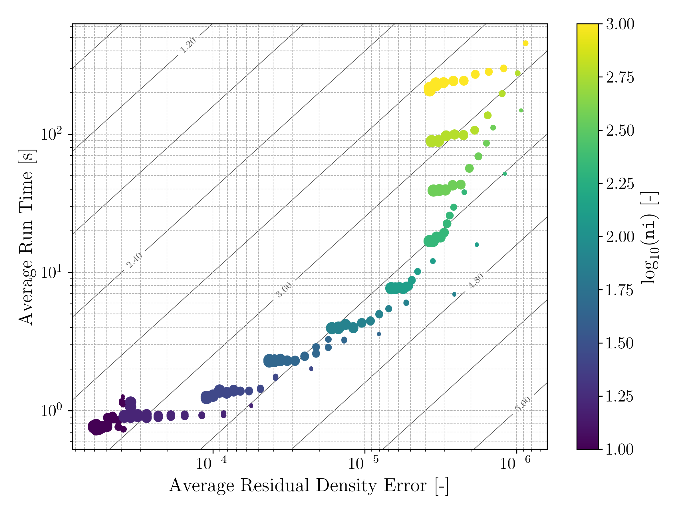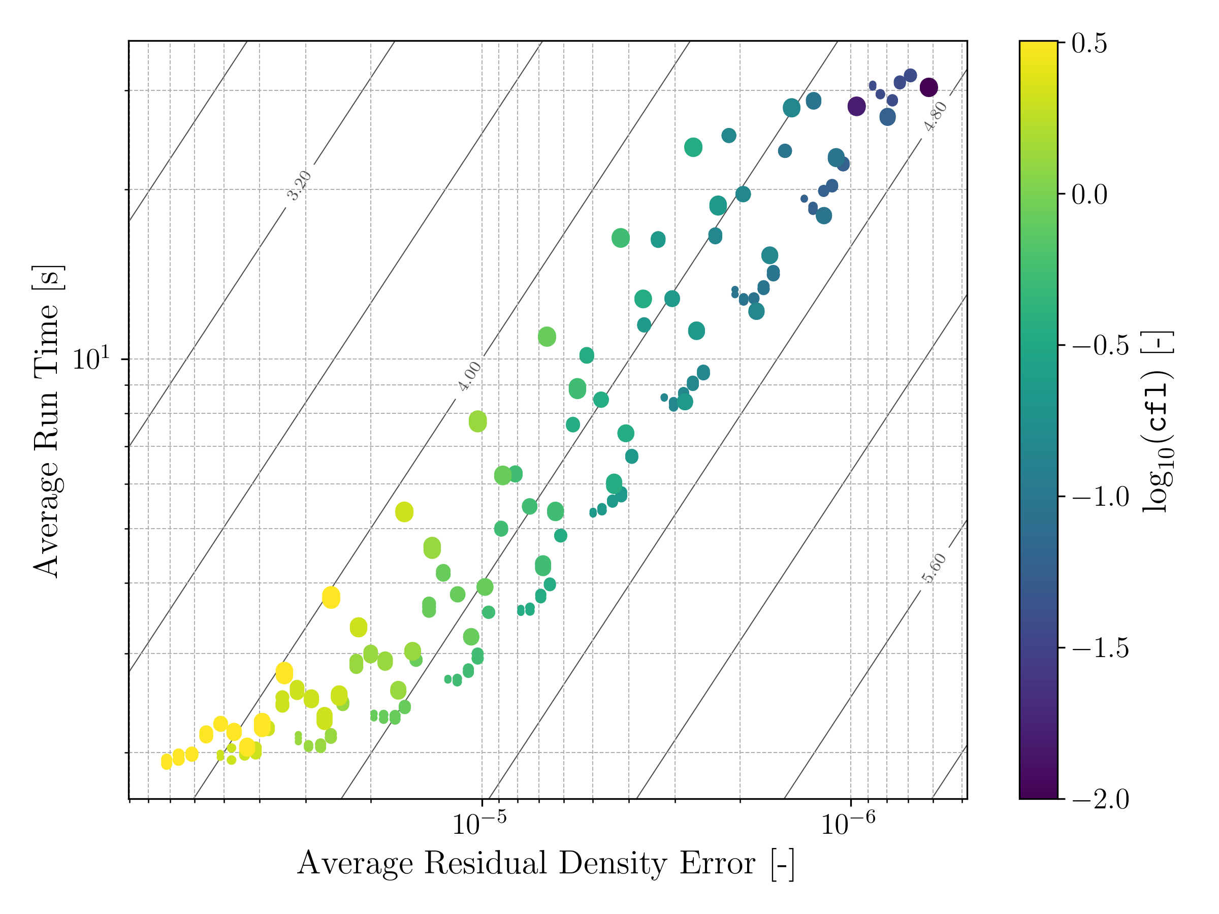 Modifications were also made to the convergence criteria to stop the solver when the last 100 calculated d_avg were all within 1% of their mean. This d_avg is the average density residual (change) across all cells in the mesh for a given iteration. This was done to prevent the solver from reaching max iterations when the solution had already converged, making it possible to measure the runtime. However, this could cause the solver to stop prematurely if the convergence was slow, and so the tolerance of 1% may need to be adjusted. The original check if the final residual error is within the bounds specified in the inputs is nested within this check.