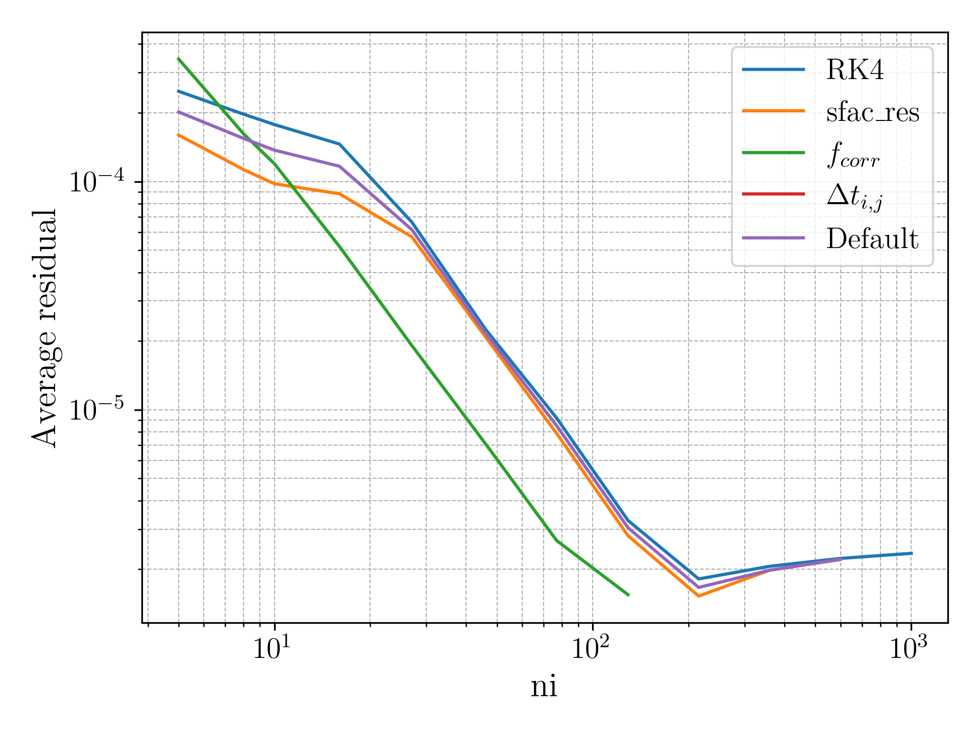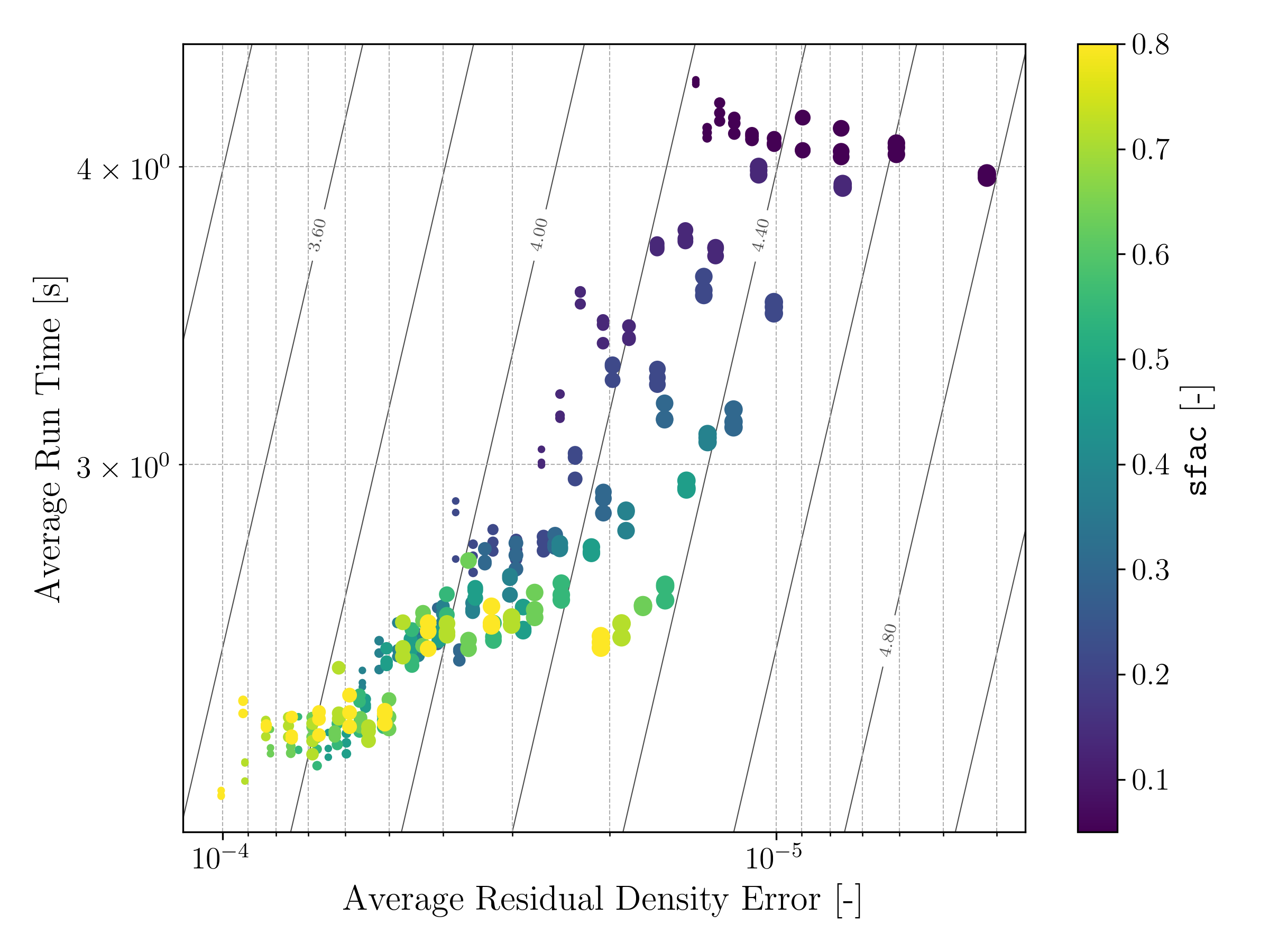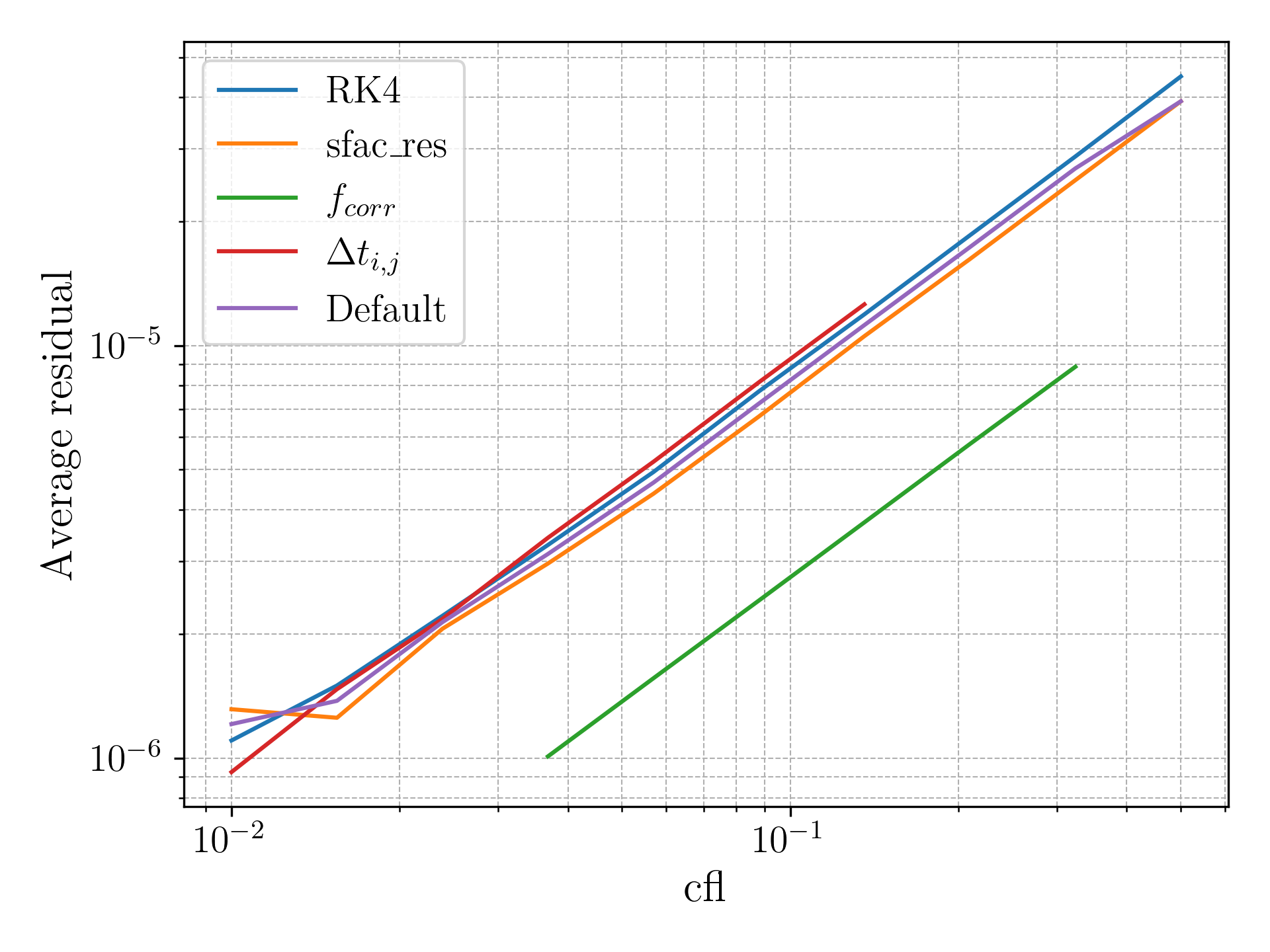 Modifications were also made to the convergence criteria to stop the solver when the last 100 calculated d_avg were all within 1% of their mean. This d_avg is the average density residual (change) across all cells in the mesh for a given iteration. This was done to prevent the solver from reaching max iterations when the solution had already converged, making it possible to measure the runtime. However, this could cause the solver to stop prematurely if the convergence was slow, and so the tolerance of 1% may need to be adjusted. The original check if the final residual error is within the bounds specified in the inputs is nested within this check.