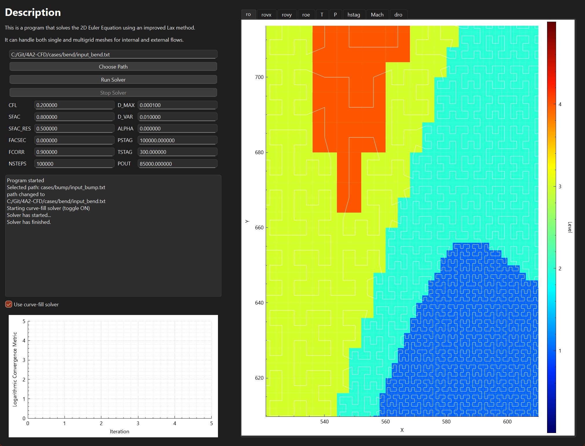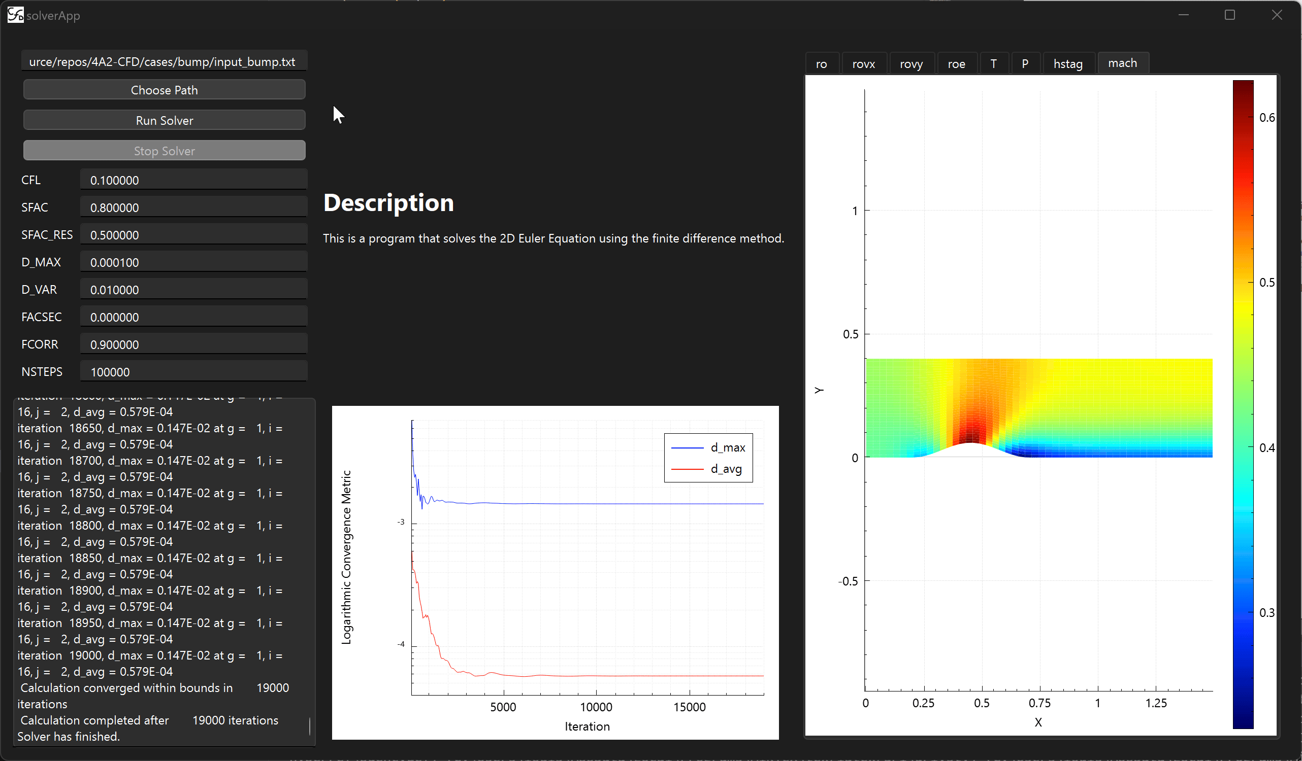 The software is a Qt application that calls fortran routines to solve the Euler equations for a 2D inviscid flow. The user interface is shown above and consists of an input panel and console on the left, a convergence plot in the middle, and various tabs for viewing grid data on the right. The solver routine is ran in a seperate thread to allow the user to interact with graphs and the console while the solver is running. Modifications made to the original code involved binding fortran types to C structs so they could be exchanged between the solver and gui threads to be plotted. This also lays some of the groundwork for future parallelisation of the solver, which may be considered in the improvements if time allows.